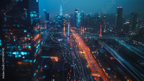 © Teeraphon, Naklejka premium Smart digital Innovation city with connection network reciprocity over the cityscape. of future smart wireless digital city and social media networking systems that connects people with in city