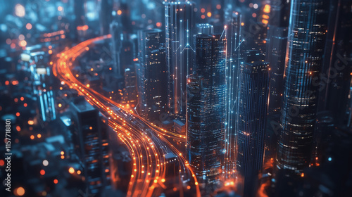 © Teeraphon, Obraz premium Smart digital Innovation city with connection network reciprocity over the cityscape. of future smart wireless digital city and social media networking systems that connects people with in city
