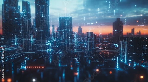 © Teeraphon, Obraz premium Smart digital Innovation city with connection network reciprocity over the cityscape. of future smart wireless digital city and social media networking systems that connects people with in city