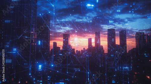 © Teeraphon, Naklejka premium Smart digital Innovation city with connection network reciprocity over the cityscape. of future smart wireless digital city and social media networking systems that connects people with in city