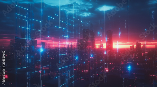 © Teeraphon, Fototapeta premium Smart digital Innovation city with connection network reciprocity over the cityscape. of future smart wireless digital city and social media networking systems that connects people with in city