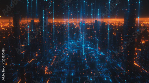 © Teeraphon, Naklejka premium Smart digital Innovation city with connection network reciprocity over the cityscape. of future smart wireless digital city and social media networking systems that connects people with in city