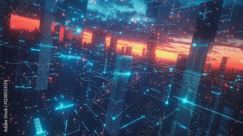 © Teeraphon, Fototapeta premium Smart digital Innovation city with connection network reciprocity over the cityscape. of future smart wireless digital city and social media networking systems that connects people with in city