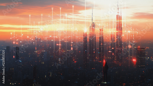 © Teeraphon, Naklejka premium Smart digital Innovation city with connection network reciprocity over the cityscape. of future smart wireless digital city and social media networking systems that connects people with in city