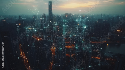 © Teeraphon, Fototapeta premium Smart digital Innovation city with connection network reciprocity over the cityscape. of future smart wireless digital city and social media networking systems that connects people with in city