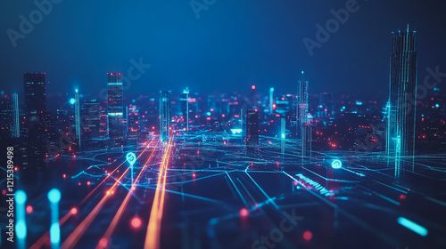 © Teeraphon, Naklejka premium Smart digital Innovation city with connection network reciprocity over the twilight cityscape. of future smart wireless digital city and social media networking systems that connects people with city