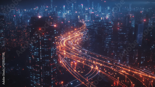 © Teeraphon, Naklejka premium Smart digital Innovation city with connection network reciprocity over the twilight cityscape. of future smart wireless digital city and social media networking systems that connects people with city
