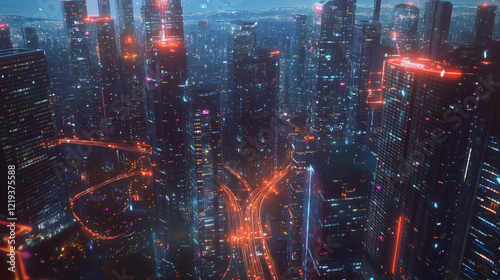 © Teeraphon, Fototapeta premium Smart digital Innovation city with connection network reciprocity over the twilight cityscape. of future smart wireless digital city and social media networking systems that connects people with city
