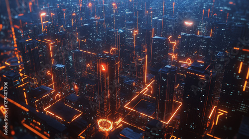 © Teeraphon, Obraz premium Smart digital Innovation city with connection network reciprocity over the twilight cityscape. of future smart wireless digital city and social media networking systems that connects people with city