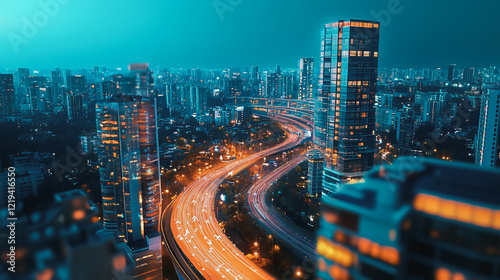 © Teeraphon, Obraz premium Smart digital Innovation city with connection network reciprocity over the twilight cityscape. of future smart wireless digital city and social media networking systems that connects people with city