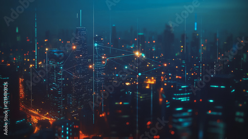 © Teeraphon, Obraz premium Smart digital Innovation city with connection network reciprocity over the twilight cityscape. of future smart wireless digital city and social media networking systems that connects people with city