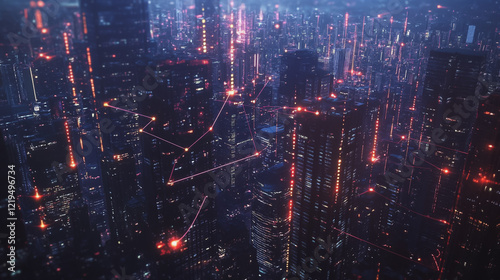 © Teeraphon, Naklejka premium Smart digital Innovation city with connection network reciprocity over the twilight cityscape. of future smart wireless digital city and social media networking systems that connects people with city