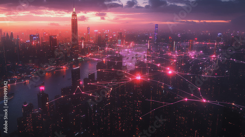 © Teeraphon, Fototapeta premium Smart digital Innovation city with connection network reciprocity over the twilight cityscape. of future smart wireless digital city and social media networking systems that connects people with city