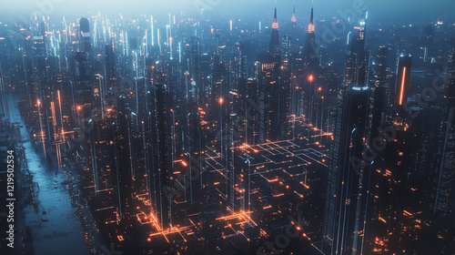 © Teeraphon, Naklejka premium Smart digital Innovation city with connection network reciprocity over the twilight cityscape. of future smart wireless digital city and social media networking systems that connects people with city