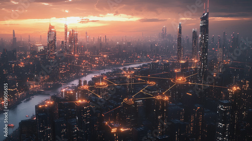 © Teeraphon, Obraz premium Smart digital Innovation city with connection network reciprocity over the twilight cityscape. of future smart wireless digital city and social media networking systems that connects people with city