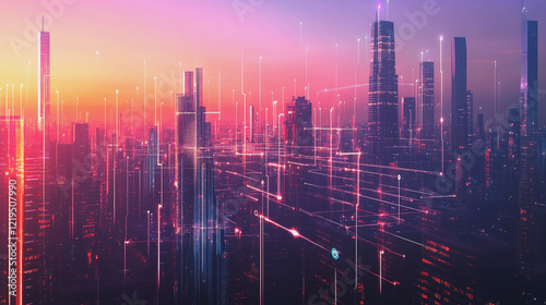 © Teeraphon, Obraz premium Smart digital Innovation city with connection network reciprocity over the twilight cityscape. of future smart wireless digital city and social media networking systems that connects people with city