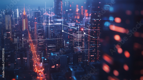 © Teeraphon, Obraz premium Smart digital Innovation city with connection network reciprocity over the twilight cityscape. of future smart wireless digital city and social media networking systems that connects people with city