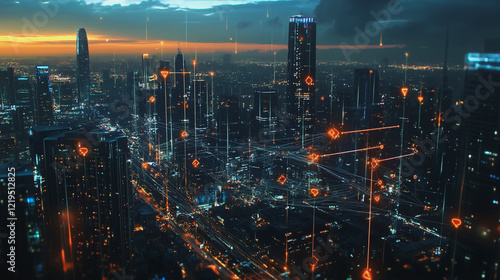 © Teeraphon, Fototapeta premium Smart digital Innovation city with connection network reciprocity over the twilight cityscape. of future smart wireless digital city and social media networking systems that connects people with city