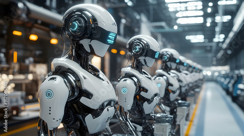 © imran, Fototapeta premium Smart factory, industry 4.0 M2M computer aided manufacturing 3D Robot automated team working AI chatbot future process futuristic industry engineering background digital technology industry revolution