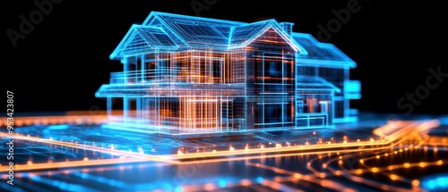 Obraz premium Smart Home Concept, 3D wireframe of a modern house with glowing digital circuits, Future of technology