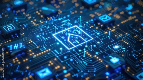 © NpicArt, Obraz premium Smart Home Technology Concept on Circuit Board