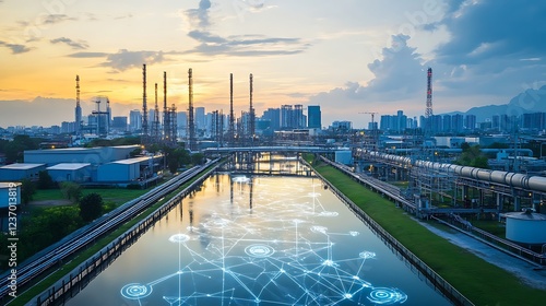 © Asih, Fototapeta premium Smart industrial park at sunset with digital network overlay on canal.