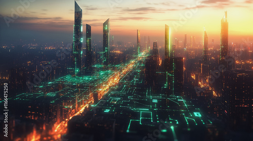 © Teeraphon, Obraz premium Smart Innovation city with connection cyber security network reciprocity over the sunset cityscape future wireless digital city and social media networking systems that connects people in the city