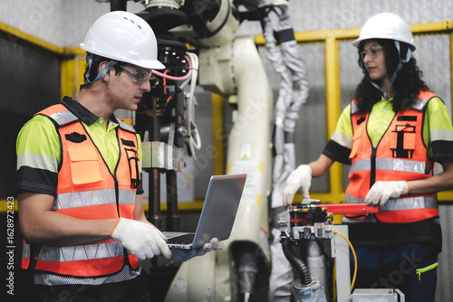 © Nassorn, Fototapeta premium Smart Latino engineer working on AI technology in robotics electronics engineering laboratory. Hispanic students' research project is programming robot machine with intelligent mechanical control