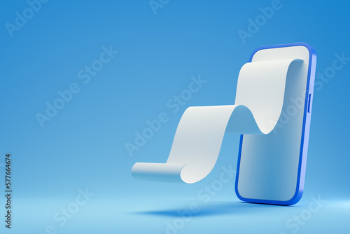 Fototapeta premium Smart phone with empty financial receipt on blue background. Payment, finance, mobile application, electronic payments. 3d rendering