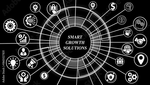 Fototapeta premium Smart Solutions Network Hub with Business and Technology Icons on Black...