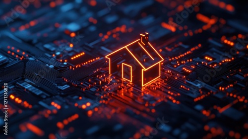 © Johannes, Obraz premium Smart system management and smart home technologies concept with glowing digital home icon surrounded by circuit lines, IOT on dark background. 3D rendering