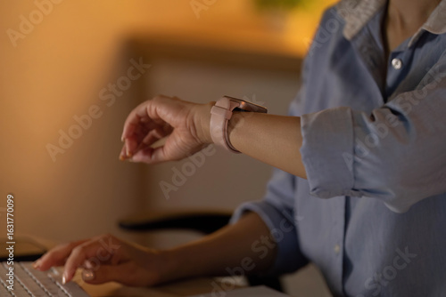 © wichayada, Fototapeta premium Smart Technology. Individual checking smartwatch while working.