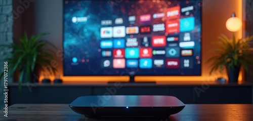© Viktor, Fototapeta premium Smart TV interface displays app icons for streaming services and video content. A media player box sits on a wooden table in a modern living room setting.