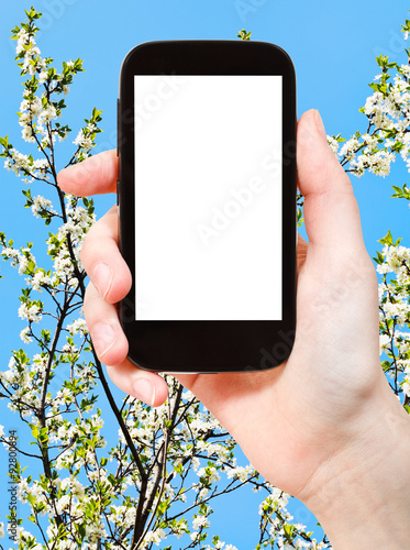 © vvoe, Fototapeta premium smartphone and white cherry tree flowers