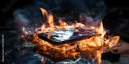 Fototapeta premium Smartphone fire caused by overcharged battery emphasizing safety and...