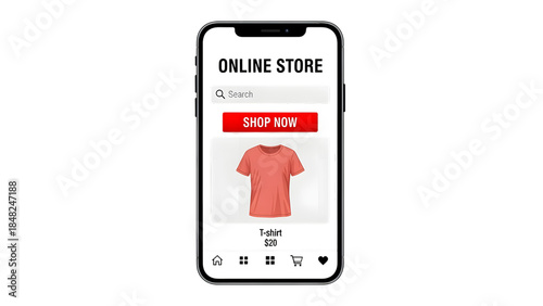 © Trendy_Desing, Fototapeta premium Smartphone screen displaying online store with t-shirt isolated on a transparent background shopping app