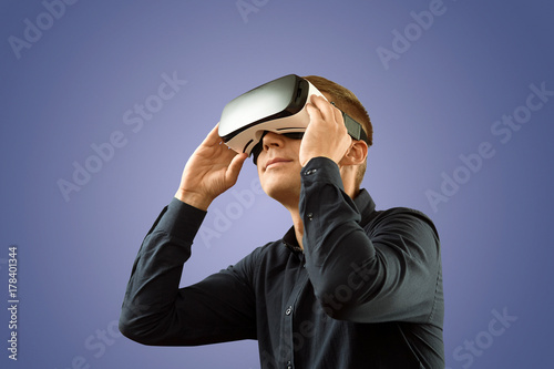 © YURII MASLAK, Fototapeta premium Smartphone using with VR glasses. Man wearing virtual reality glasses. Virtual reality today.