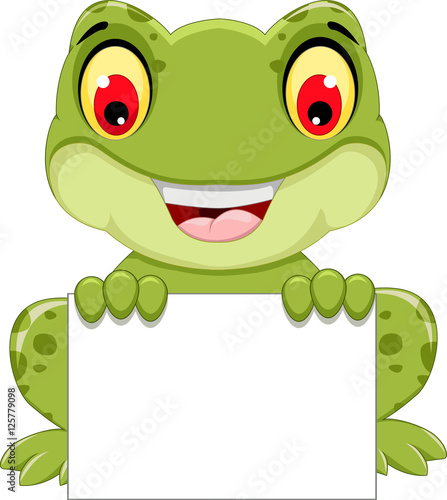 © jihane37, Fototapeta premium śmieszne kreskówka żaba siedzi trzyma pusty znak