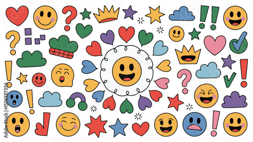 © MdIftekhar, Fototapeta premium Smile brush hand drawn vector element set. Emoji fun face, heart, crown symbol crayon texture marker background kid sketch style hand drawn element. Color smiley face, arrow. Vector illustration