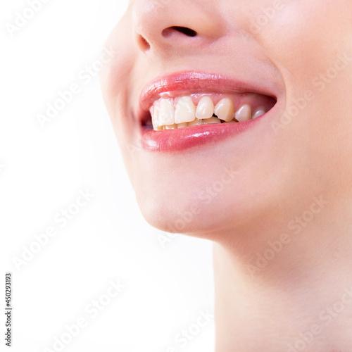 © Khorzhevska, Fototapeta premium Smile. healthy and beautiful. Laughing woman, female mouth with great teeth over white background. Teeth health, whitening, prosthetics and care. Happiness and joy