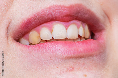 Obraz premium smile of restored teeth in a teenager with a corrected bite. Dental care and...