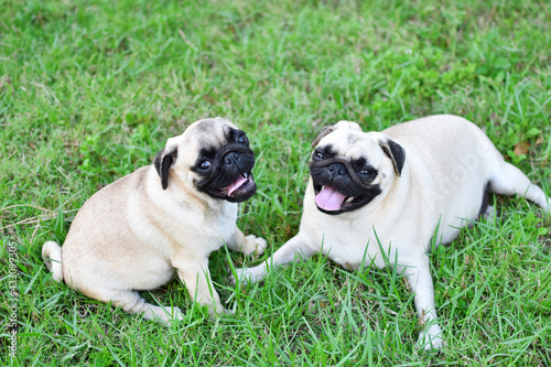 Fototapeta premium Smile puppy Pug, cute puppy brown Pug in home garden