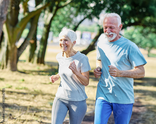 © Lumos sp, Fototapeta premium Smiling active mature senior couple jogging together in the park