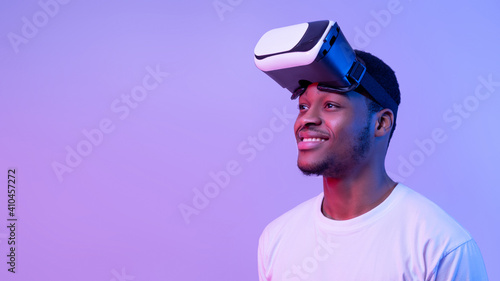 © Prostock-studio, Fototapeta premium Smiling African American Guy Wearing VR Glasses And Looking Aside, Neon Light