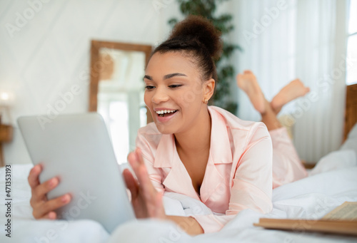 © Prostock-studio, Fototapeta premium Smiling african american lady in pajama laying on bed and using modern digital tablet, copy space