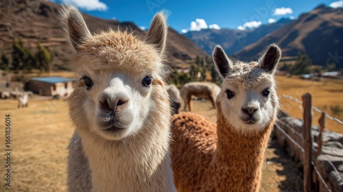 Fototapeta premium Smiling Alpacas in Sunlit Mountain Farm Setting