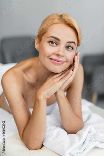Fototapeta premium smiling and blonde client lying on massage table
