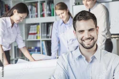 Fototapeta premium Smiling architect looking at camera while colleagues are planning around a table and looking at a blueprint