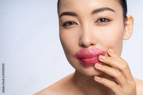 Obraz premium Smiling Asian lady is putting patch on lips