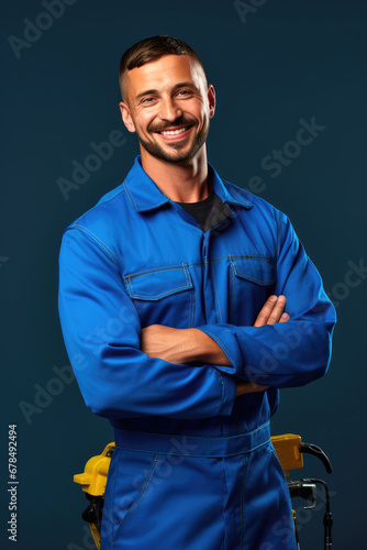 © piai, Fototapeta premium Smiling auto mechanic on a simple bright color background